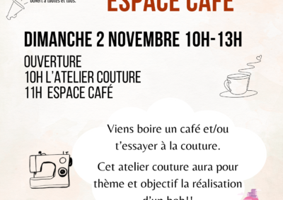 Ouvert : à partir de 10h: atelier couture et à partir de 11h: espace café